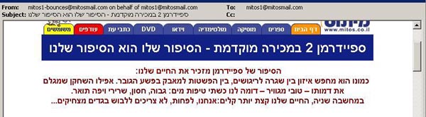 מבין כל המיילים שאני מקבל מספקי שירות אלה ואחרים, המנסים נואשות למכור לי משהו ולא מצליחים, מיתוס זוכים – עם האי-מייל לעיל (לא נגענו…) – ללא ספק ובלי מתחרים בתואר האי-מייל המטופש ביותר שראיתי זה זמן רב. אם להשתמש בפרפראזה על המייל שלהם עצמם, הסיפור שלהם הוא הסיפור שלנו. סיפור של חוסר טעם, חוסר הומור ומעל הכל חוסר כבוד לתרבות אותה הם מתיימרים לשווק.