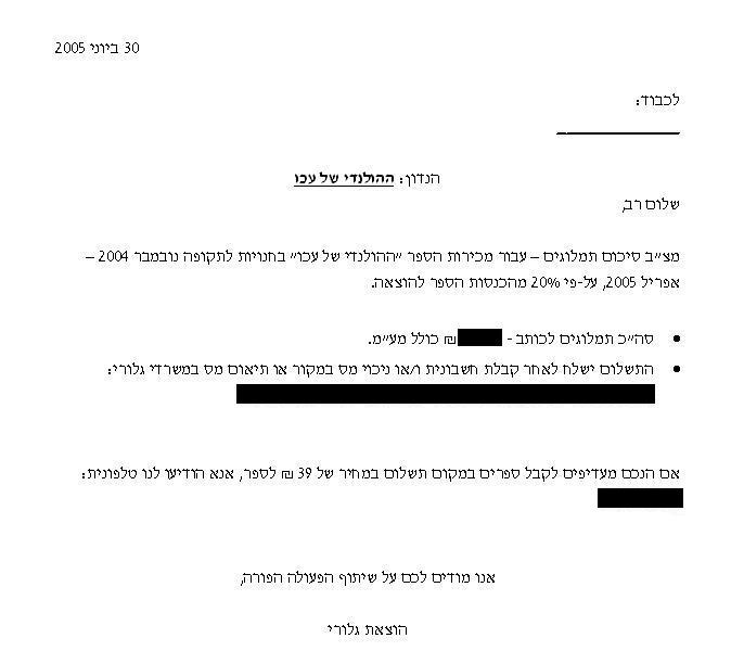 נ.ב. למהרהרים בנוגע לסכום התמלוגים המדויק (המחוק לעיל), אספר בסוד כי לאחר תשלום מס לרשויות כנדרש, אוכל להבטיח את עתידו של ילדי הקט ולרכוש לו חיתולים שיספיקו לו לפחות עד… שבוע הבא. טוב, אבא שלו יושב וכותב שירים (וגם סיפור-שניים).
