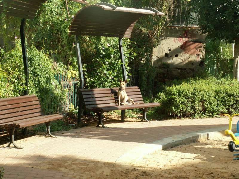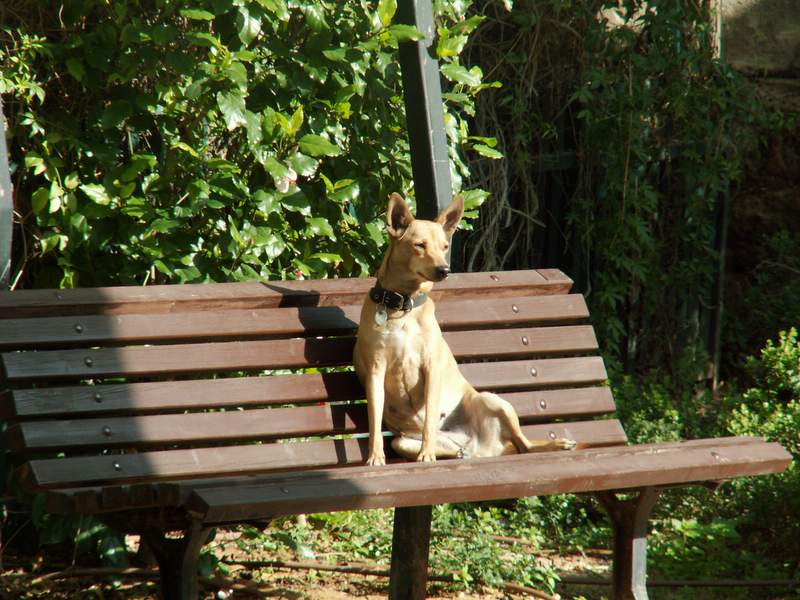 כלב יושב על ספסל בגן ציבורי, נווה צדק