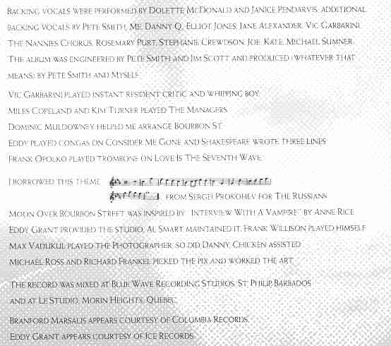כן, ילדים וילדות, אינכם טועים או מתבלבלים: סטינג מודה כאן – ובגדול – למלחין ממנו שאב את המנגינה שמלווה את "רוסים", ואפילו מביא את התיבות אותן שאל (סימפל, במונחים של ימינו). בלי לגנוב קרדיט לעצמו, בלי "לשכוח" או לדחות את העניין לאחר-כך, סטינג נותן קרדיט איפה שמגיע, ואני מודה ומתוודה שאני לא רואה משהו כזה קורה היום, ואחרי-זה שאף-אחד לא יתפלא שאף-אחד לא נותן כבוד לאף-אחד בימינו.