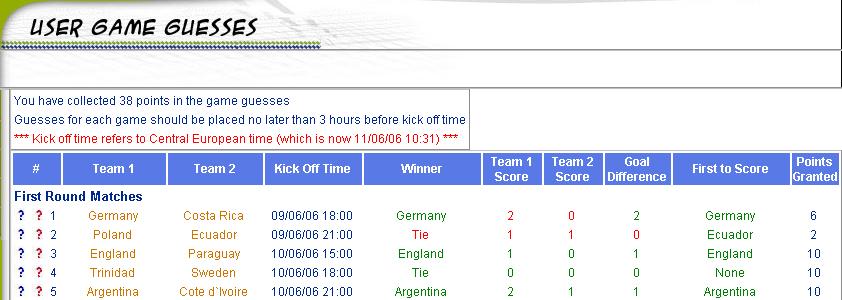 בכל אשם ד'. הוא זה ששלח לי את הלינק לפרוייקט קטן וחובבני של הימור על תוצאות המונדיאל, שהרימו כמה חברים יודעי כדורגל וווב. הצטרפתי רק בשביל הקטע, כי כדורגל לא ממש עושה לי את זה מחד, ומאידך ידיעותיי בנושא די מצומצמות, ובכל זאת העניין היה נראה די מרתק: להמר על תוצאות כל אחד מהמשחקים עד לגמר ולראות כמה נקודות אוכל לצבור. הציפיות היו נמוכות, ובכל-זאת השקעתי את מעט הזמן (והכסף) והלכתי על זה.
